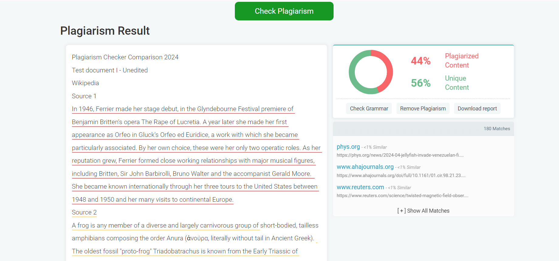 Der Plagiatsbericht auf der Website ist einfach zu navigieren, da er verschiedene Farben für verschiedene Quellen verwendet. Das Tool zeigt an, wie viele Wörter ein plagiierter Abschnitt hat und gibt einen Ähnlichkeitsprozentsatz an.